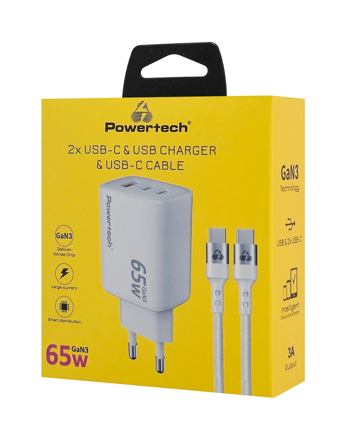 Υψηλής απόδοσης φορτιστής τοίχου της Powertech, κατασκευασμένος από ανθεκτικό υλικό και συμβατός με συσκευές που φορτίζουν μέσω θύρας USB. Διαθέτει 1x USB και 2x USB-C θύρες εξόδου που υποστηρίζουν φόρτιση με μέγιστη απόδοση 65W.