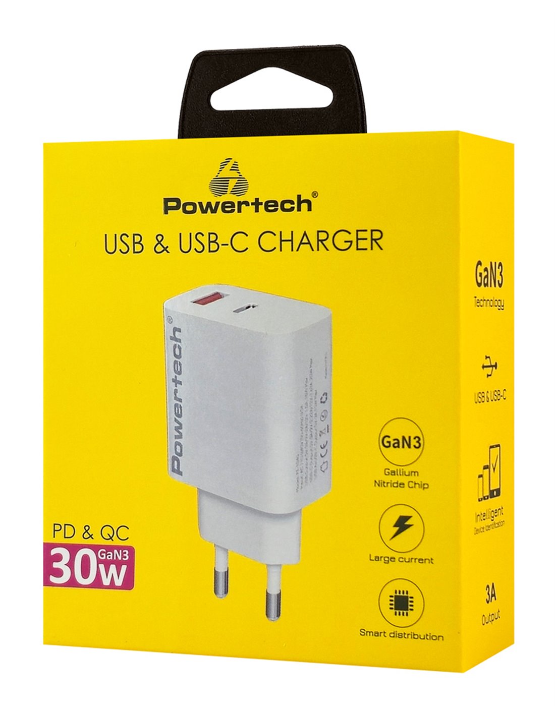 Υψηλής απόδοσης φορτιστής τοίχου της Powertech, κατασκευασμένος από ανθεκτικό υλικό και συμβατός με συσκευές που φορτίζουν μέσω θύρας USB. Διαθέτει USB και USB-C θύρες εξόδου που υποστηρίζουν φόρτιση με μέγιστη απόδοση 30W.