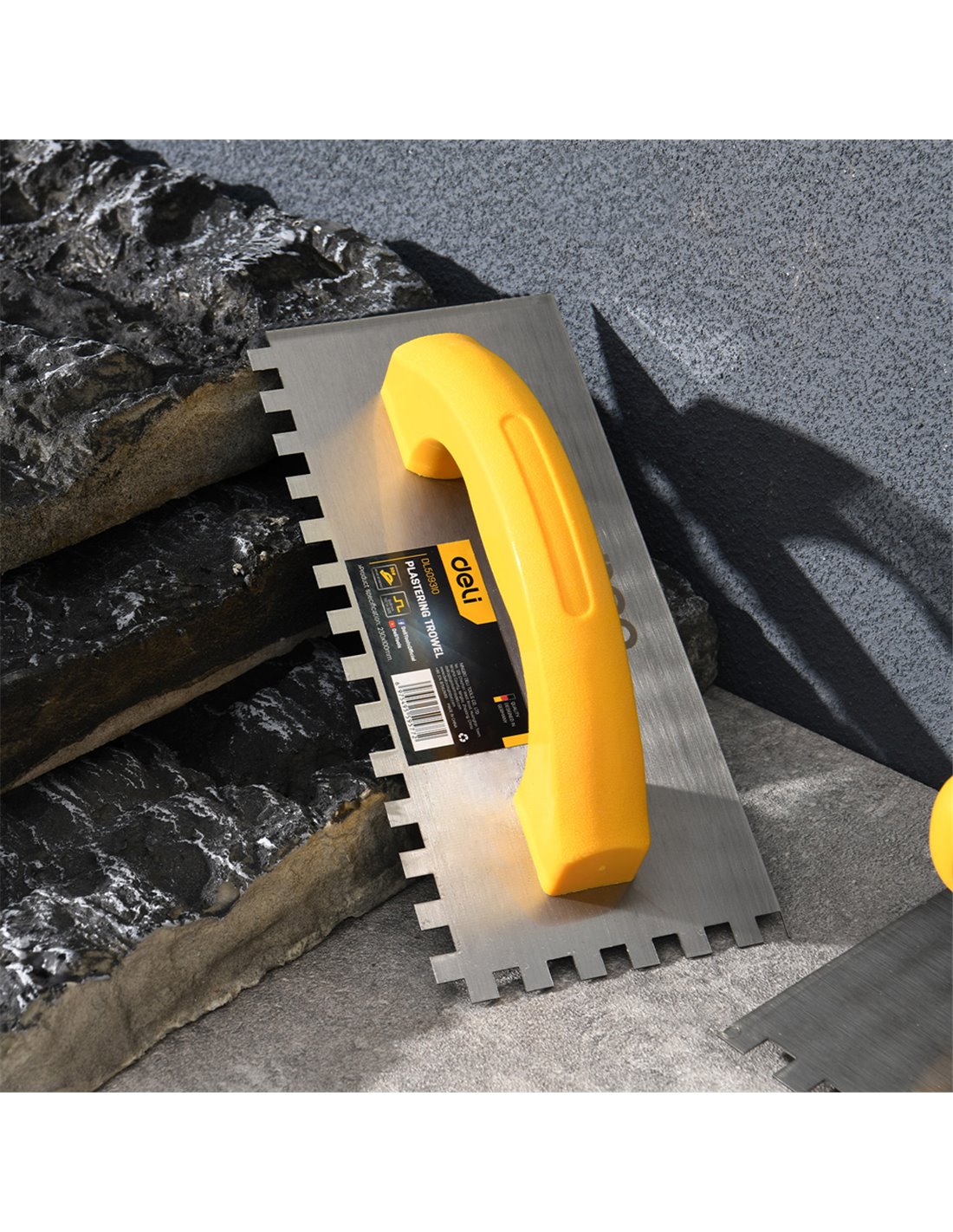 Σπάτουλα πλακιδίων της DELI με ανθεκτική λάμα από χάλυβα άνθρακα και πλαστική λαβή. Είναι ιδανική για εργασίες σοβατίσματος και ομοιόμορφη εφαρμογή κόλλας πλακιδίων σε δάπεδα και τοίχους.