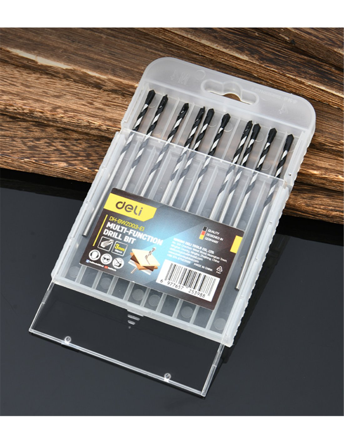 Σετ τρυπάνια της Deli κατάλληλα για χρήση σε επιφάνειες από πέτρα, μέταλλο, ξύλο, μάρμαρο κ.α. Η συσκευασία περιλαμβάνει 10 τρυπάνια.