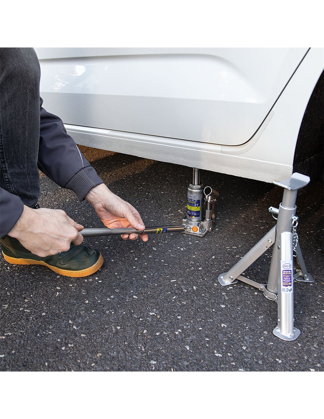 Υδραυλικός γρύλος μπουκάλας της ALCA ιδανικός για την ανύψωση αντικειμένων όπως αυτοκίνητα, με δυνατότητα ανύψωσης έως 31cm και μέγιστό βάρος 2 τόνους.