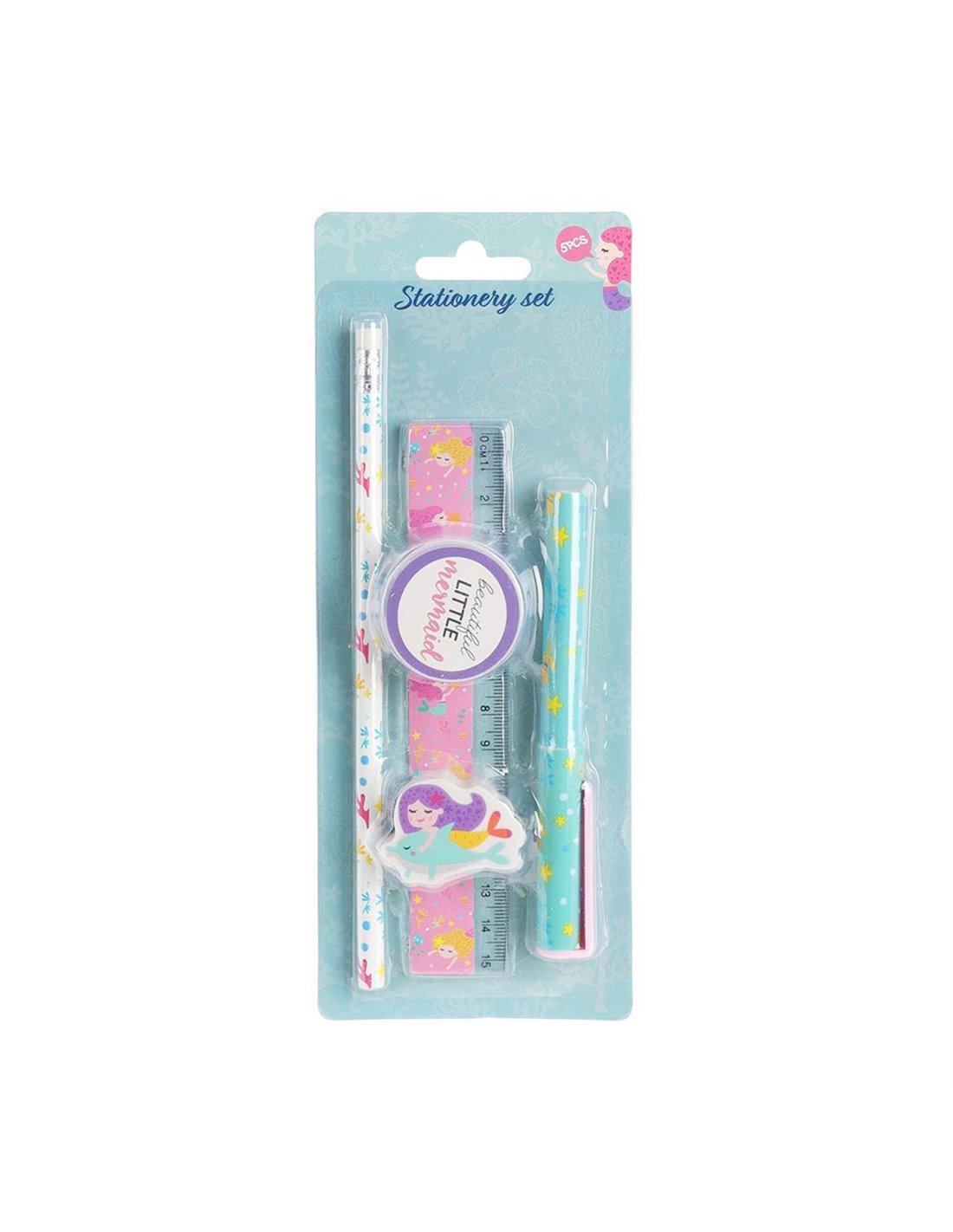 Σχολικό σετ 5 τεμαχίων "Γοργόνα". Το σετ περιλαμβάνει ένα μολύβι HB, ένα στυλό ballpoint 15εκ., έναν χάρακα 15εκ., 1 γόμα Ø4x1,2εκ. και μια ξύστρα Ø2,8εκ. Διατίθεται σε πανέμορφη, συσκευασία δώρου διαστάσεων Υ23x9x9εκ.