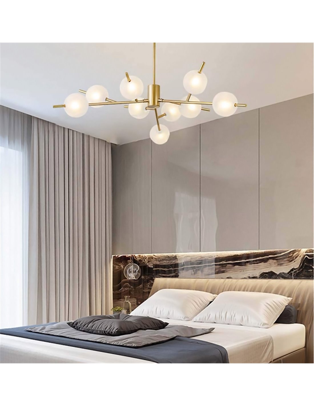 Πολύφωτο φωτιστικό οροφής με μεταλλικό σώμα και 9 στρογγυλούς, γυάλινους γλόμπους, σε λευκό χρώμα. Διαθέτει συμπαγές σώμα στο οποίο στηρίζονται τρεις βραχίονες όπου κάθε ένας από αυτούς εξοπλίζεται με τρία ντουί. Οι γλόμποι είναι λευκοί, διαχέοντας το φως προς κάθε κατεύθυνση, ενώ προσφέρουν το πλεονέκτημα απόκρυψης της λάμπας.