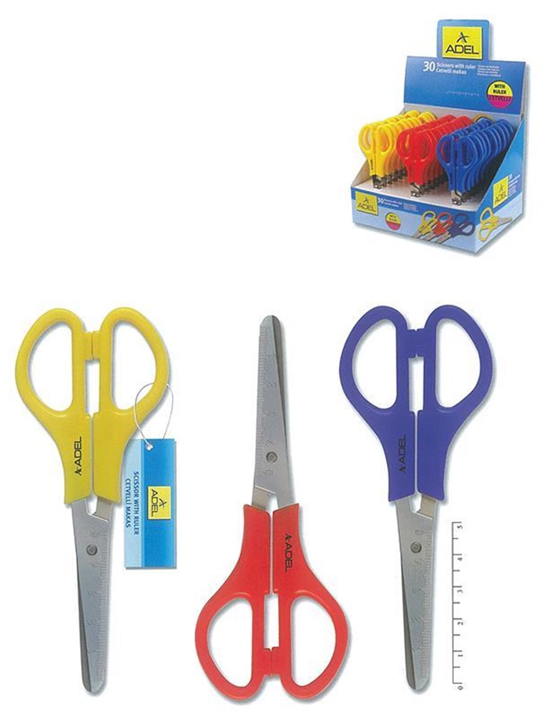 Adel ψαλίδι μαθητικό. Ανοξείδωτο, με χάρακα στην εξωτερική πλευρά της λάμας. Κοκτέηλ 3 χρώματα. Διαστάσεις: 13εκ.