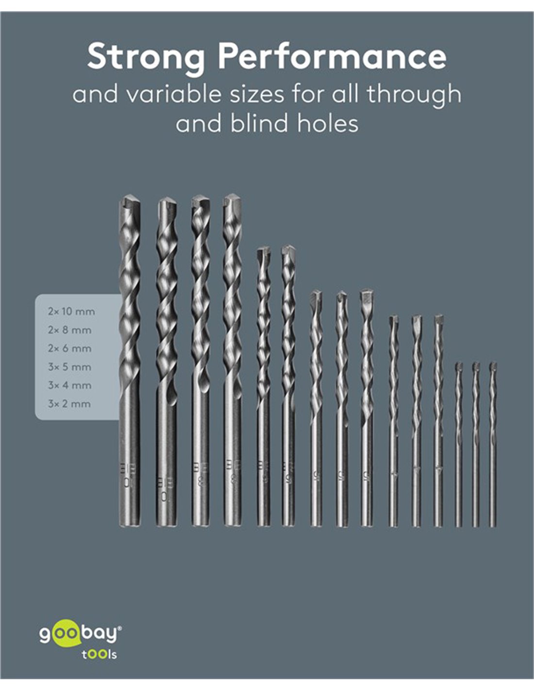 Σετ τρυπάνια της Goobay που αποτελείται από 15 τρυπάνια σε διαφορετικά μεγέθη, κατάλληλα για χρήση σε τοίχους και μπετόν.