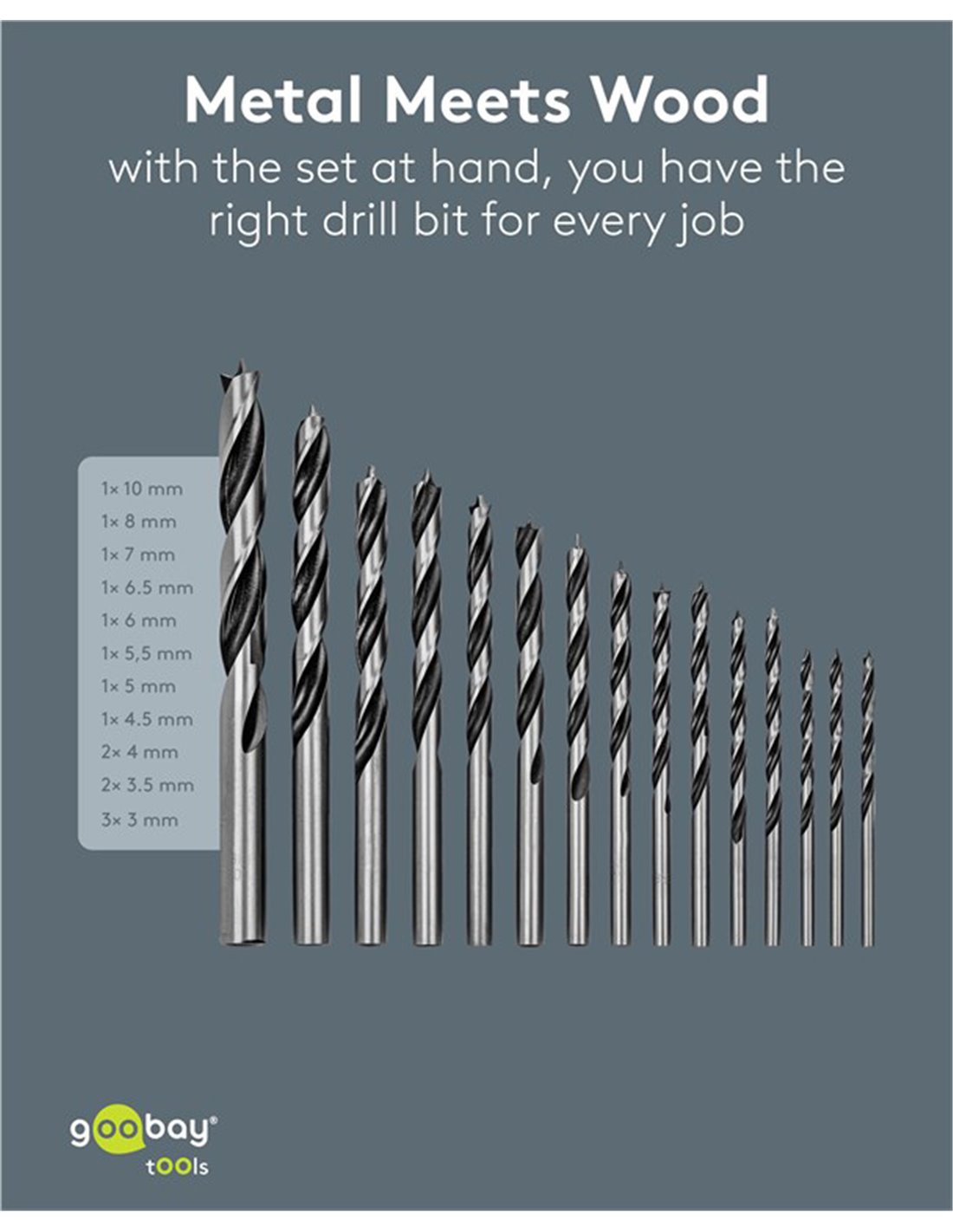 Σετ τρυπάνια της Goobay που αποτελείται από 15 τρυπάνια σε διαφορετικά μεγέθη, κατάλληλα για χρήση σε ξύλινες επιφάνειες.