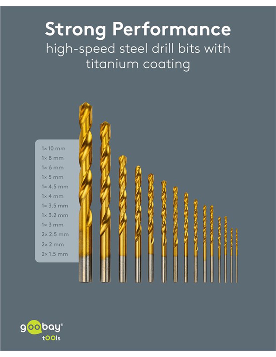 Σετ τρυπάνια της Goobay που αποτελείται από 15 τρυπάνια σε διαφορετικά μεγέθη, κατάλληλα για χρήση σε μεταλλικές επιφάνειες.