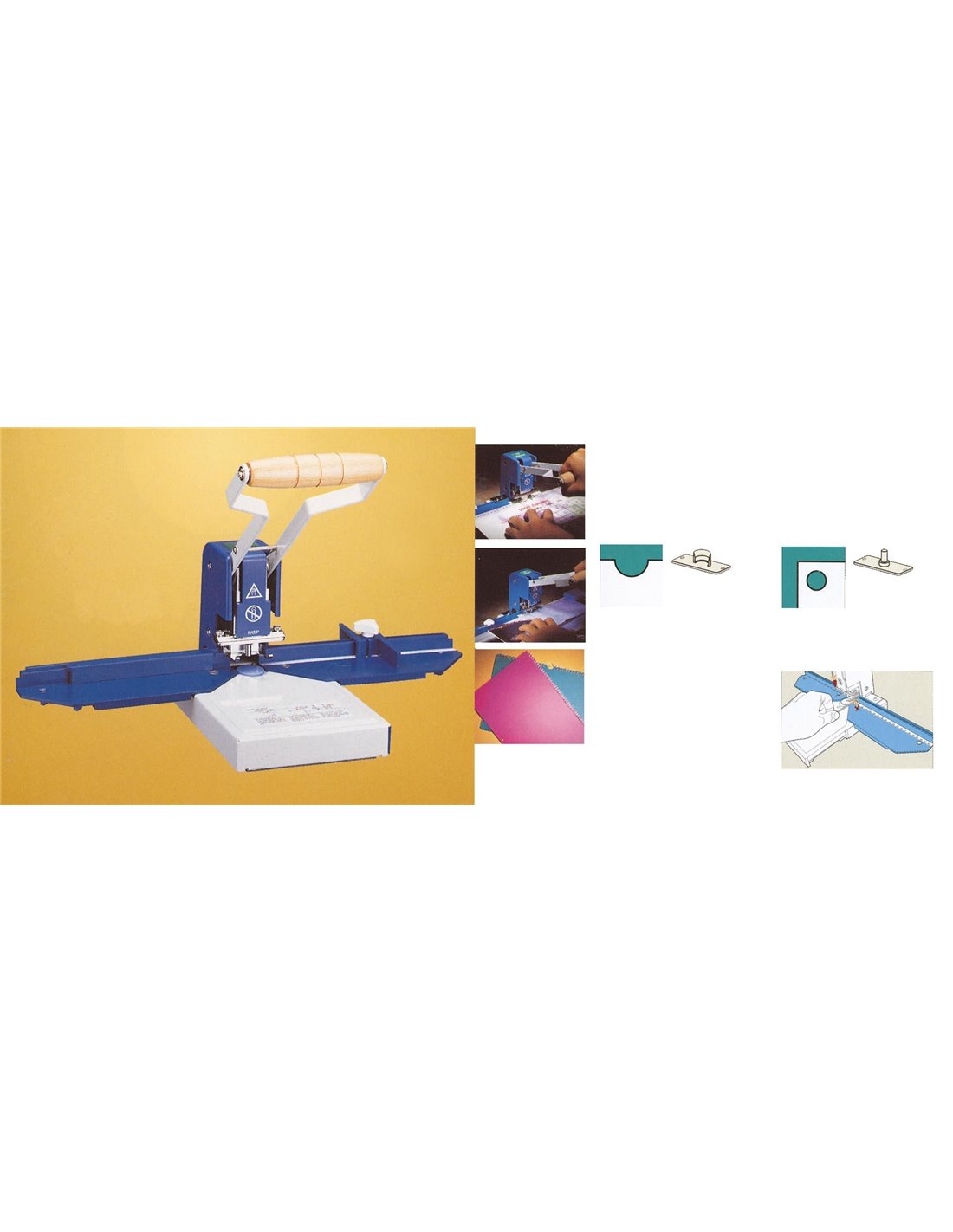 Μηχανή κοπής ημικυκλίου ημερολογίου - τρυπητικό μίας τρύπας - γωνιοκόπος. Είναι απαραίτητη για βιβλίοδεσία σπιράλ ημερολογίων τοίχου (κάνει το υμικύκλιο που μπαίνει στο κρεμαστάρι). Στην συσκευασία περιλαμβάνεται και επιπλέον καλούπι γωνιοκοπής και καλούπι μονής τρύπας. Περιλμαβάνει: έναν οδηγό χαρτιού, ένα μαχαίρι κοπής ημικυκλίων, ένα τρυπητικό κύκλων και ένα μαχαίρι γωνιοκοπής. Είναι κατάλληλο για επαγγελματική χρήση, για ημερολόγια σπιράλ τοίχου, για τρύπημα χαρτιού και για γωνιοκοπή χαρτιού. Τρυπάει έως 110 φύλλα (1εκ. πάχους) τη φορά.