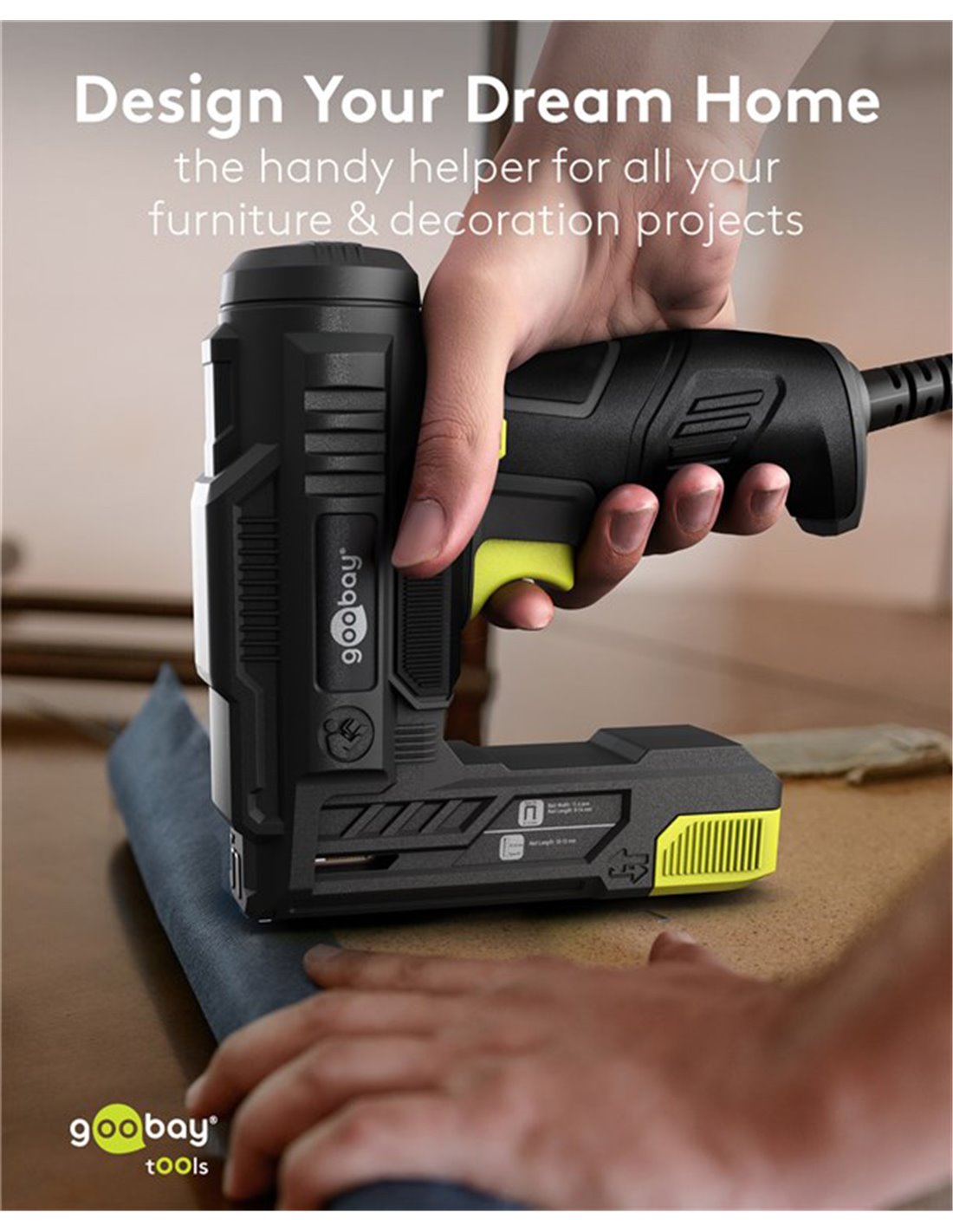 Πρακτικό και ισχυρό, ηλεκτρικό καρφωτικό της Goobay, ιδανικό για επισκευές/συναρμολογήσεις επίπλων, εργασίες ταπετσαρίας, στερέωση μονωτικών υλικών ή σοβατεπιών και DIY εφαρμογές.