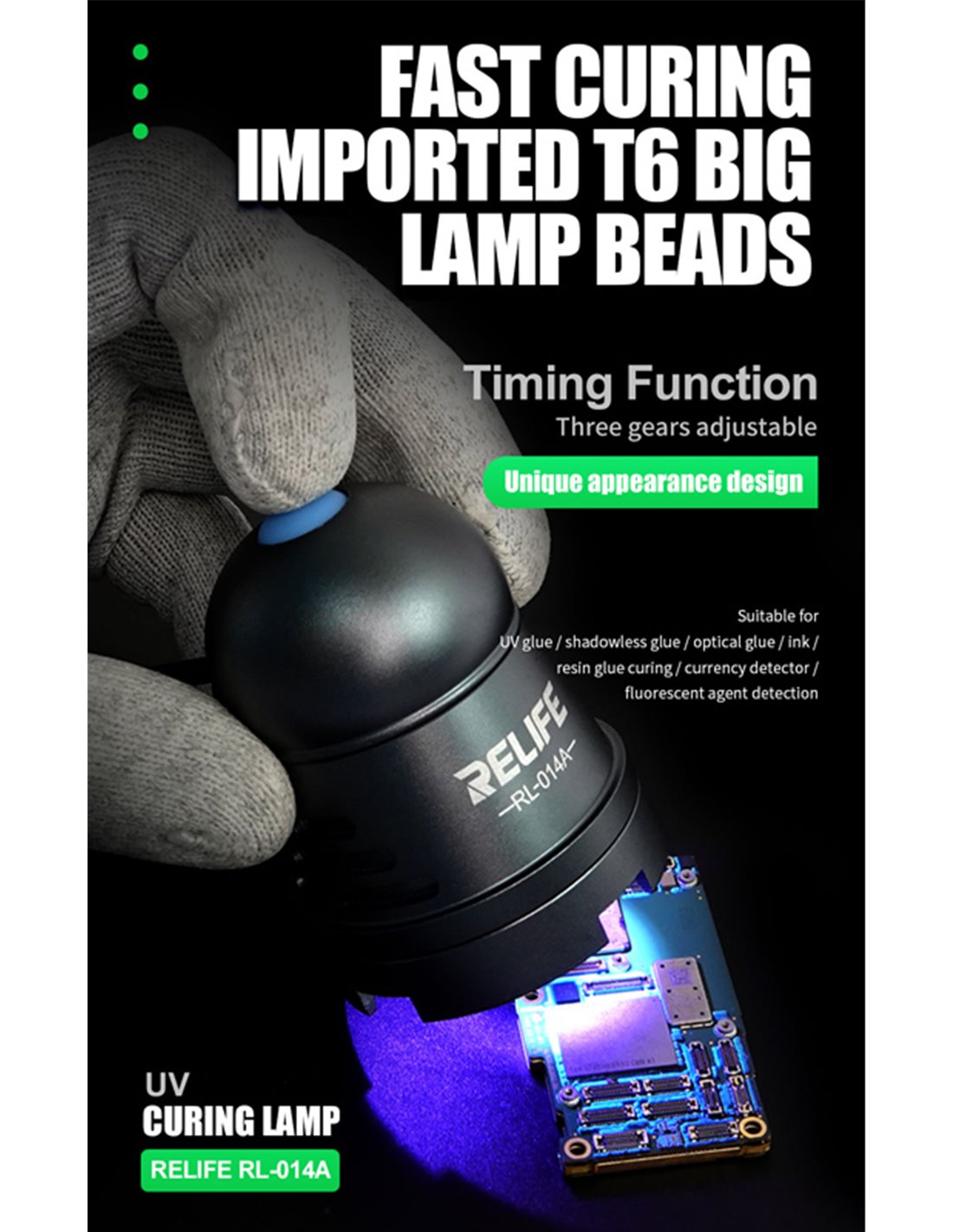 Λάμπα UV από την Relife, κατάλληλη για το στέγνωμα κόλλας UV. Διαθέτει 3 επίπεδα φωτεινότητας και timing λειτουργία. Η τροφοδοσία του γίνεται μέσω καλωδίου USB το οποίο είναι ενσωματωμένο πάνω στην λάμπα.