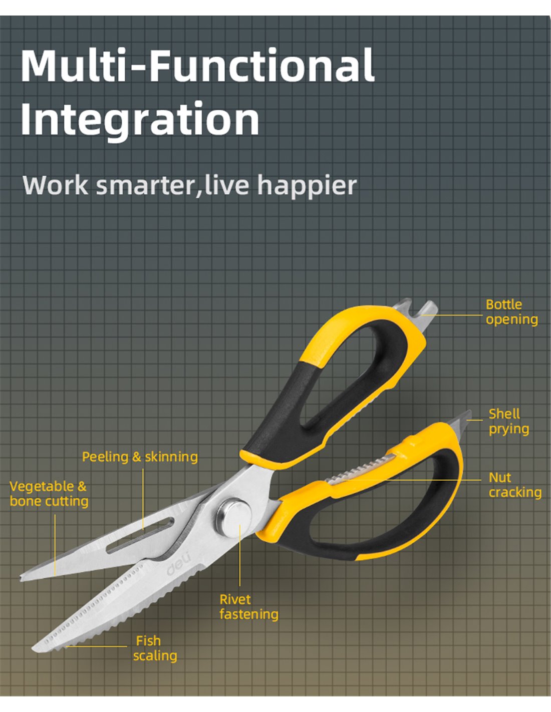 Ψαλίδι πολλαπλών χρήσεων της Deli, κατάλληλο για κοπή λαχανικών και οστών, ξεφλούδισμα, αλλά και για βοηθητικές λειτουργίες όπως άνοιγμα μπουκαλιών και σπάσιμο ξηρών καρπών. Η εργονομική, αντιολισθητική λαβή προσφέρει άνετο και ασφαλές κράτημα.