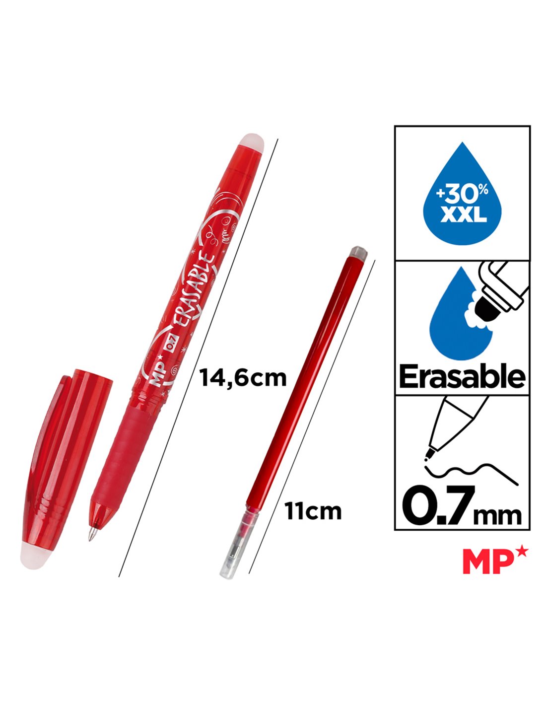 Στυλό διαρκείας της MP με μελάνι που σβήνει μέσω της ειδικής γόμας που διαθέτει. Διαθέτει καπάκι με κλιπ για να ασφαλίζει στις τσέπες των ρούχων και στα τετράδια.
