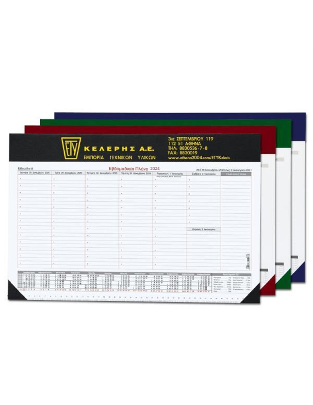 Next εβδομαδιαίο πλάνο γραφείου 53 φύλλων. Οι ημερομηνίες και οι ονομαστικές γιορτές είναι τυπωμένες σε κάθε εβδομάδα. Από χαρτί 90γρ. και χοντρό οπισθόφυλλο 800γρ. Συσκευασία ανά τεμάχιο σε αεροστεγή διάφανη ζελατίνα. Διαστάσεις: 30x43εκ. Φάσα σε 4 διαφορετικά χρώματα: μαύρο, μπορντώ, πράσινο και μπλε.