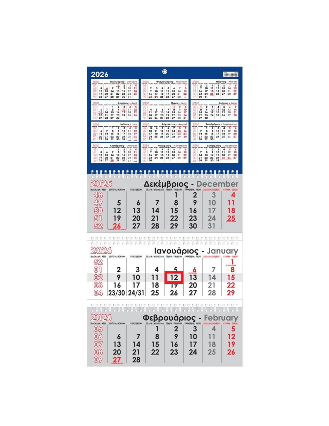 Next ημερολόγιο τοίχου 2026 τριμηνιαίο με 3 σπιράλ επί 12φ. 31x59εκ.