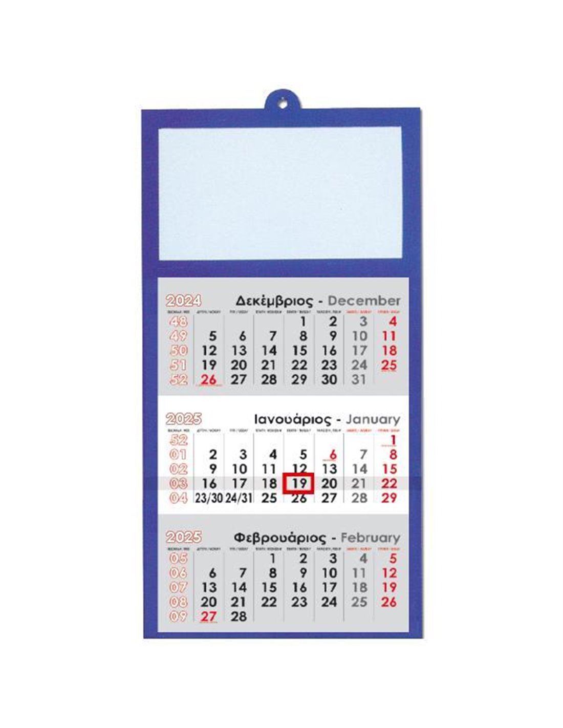 Next τριμηνιαίο ημερολόγιο τοίχου. Από χαρτόνι ινβερκόατ 400γρ. και γυαλιστερή πλαστικοποίηση. Διαστάσεις: 33x60εκ. Χρώμα: μπλε.