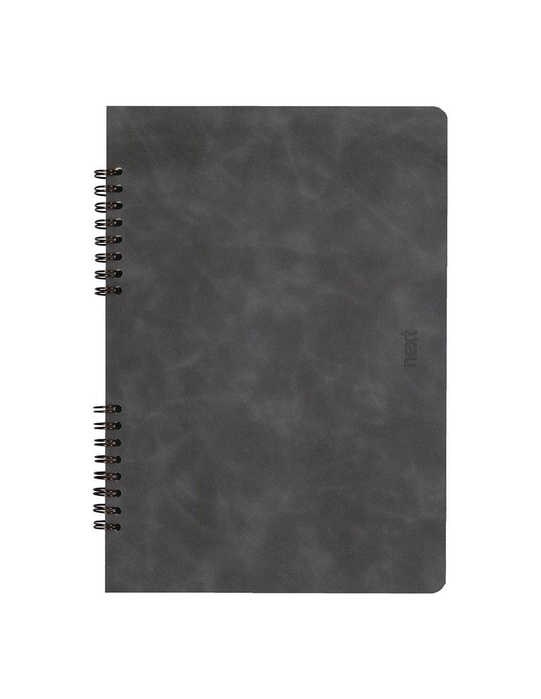 Next τετράδιο σπιράλ Premium γκρι. Εξώφυλλο και οπισθόφυλλο eco leather (πυρογραφική δερματίνη - PU). Πυρογραφία στο εξώφυλλο. Μπρονζέ σπιράλ 2 κομμάτια (όχι συνεχόμενο). Χαρτί 70γρ., λευκό premium, ριγέ. 3 θεμάτων. Διαστάσεις: 17x25εκ.