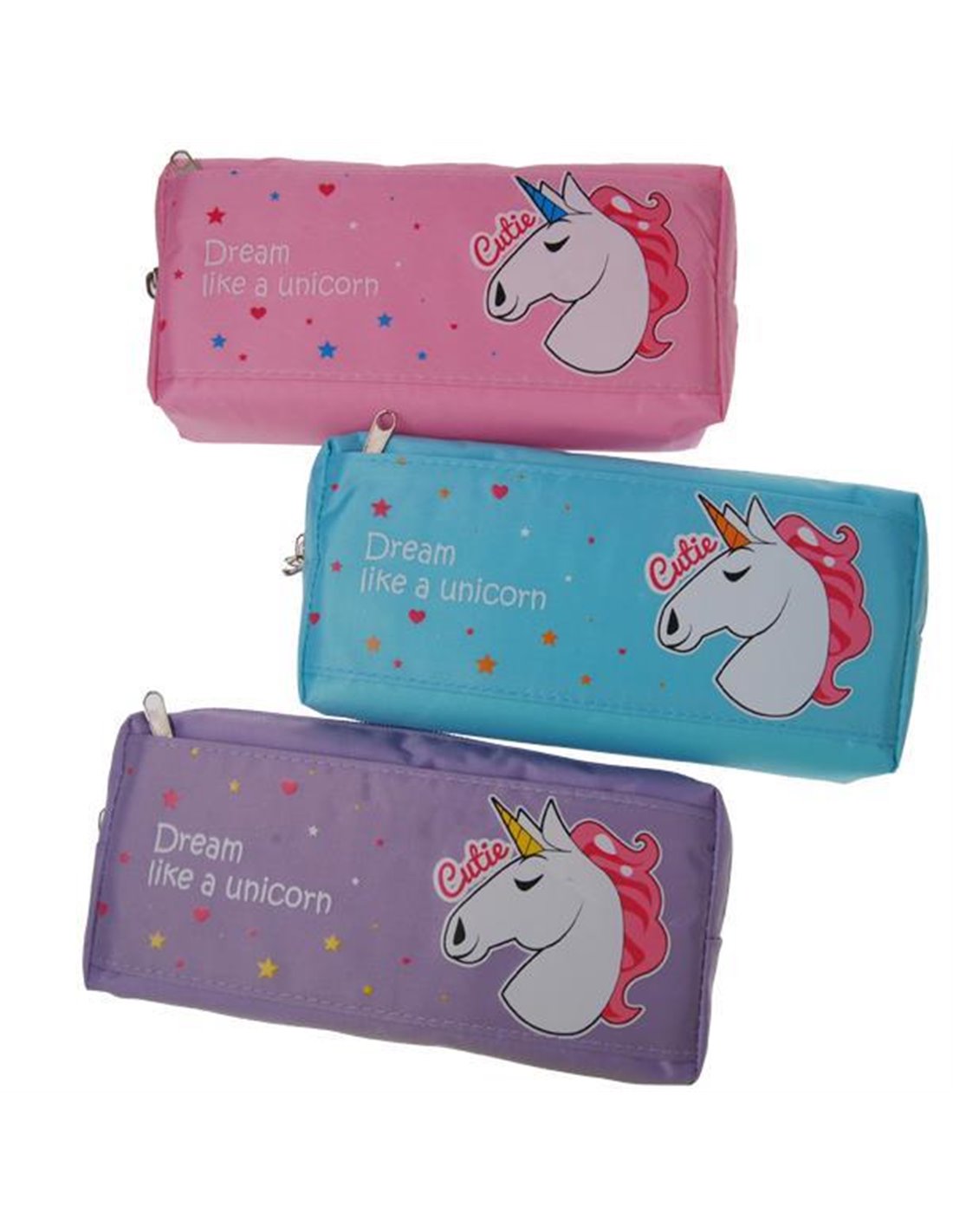 Κασετίνα "μονόκερος". Πολύ πρακτική. Με 2 φερμουάρ. Κοκτέηλ 3 χρώματα. Διαστάσεις: 20x9,5εκ.