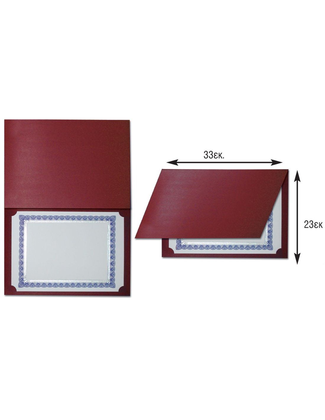Πολυτελή θήκη επαίνων-πτυχίων. Διπλή για τοποθέτηση πτυχίων-επαίνων Α4. Από ειδικό πολυτελές χαρτόνι Αμερικής. Διαστάσεις: 33x23εκ. Χρώμα: μπορντώ.