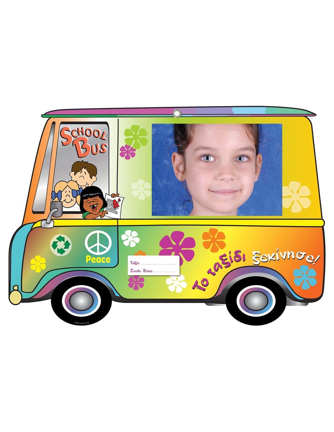 Σχολικό ενθύμιο "Λεωφορείο" με κοπτικό. Από σκληρό χαρτόνι 2.5 χιλιοστών. Τυπωμένο 4χρωμία 2 όψεις. Με μεταλλικό τρουκ για να κρέμεται στον τοίχο σαν κάδρο. Κλασσικό αναλογικό ενθύμιο. Κολλάτε την φωτογραφία του μαθητή και της τάξης (εώς 13χ18εκ.). Διαστάσεις: 43x30εκ.