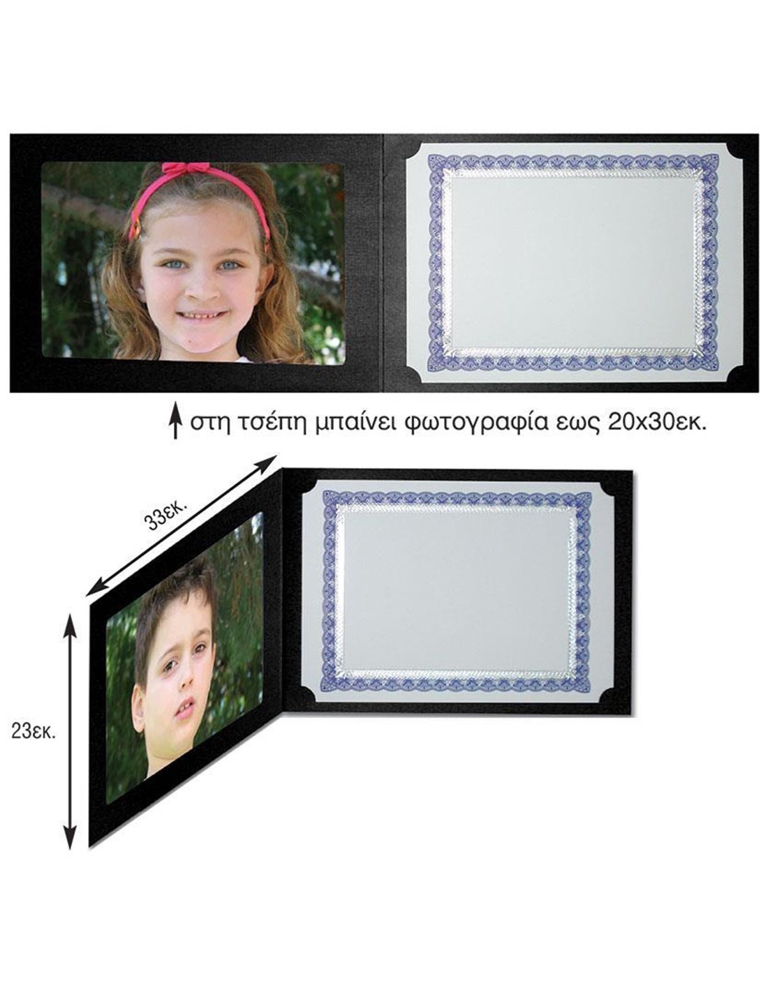 Πολυτελή θήκη επαίνων-πτυχίων. Τριπλή για τοποθέτηση πτυχίων-επαίνων Α4. Από ειδικό πολυτελές χαρτόνι Αμερικής. Με ειδική τσέπη μπροστά για να μπεί φωτογραφία. Διαστάσεις: 33x23εκ. Χρώμα: μαύρο.