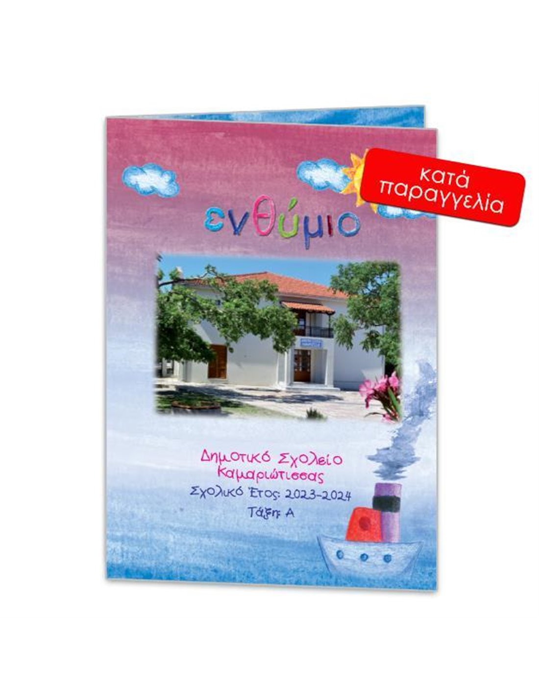 Σχολικό ενθύμιο ψηφιακό δίφυλλο "Καράβι". Χαρτόνι 400γρ. Μέγεθος Α4 (21χ29εκ.) κλειστό. Α3 (30χ43εκ.) ανοιχτό. Εκτύπωση 4χρωμία 2 όψεις και γυαλιστερή πλαστικοποίηση εξωτερικά. Ψηφιακή εκτύπωση και του ονόματος , του σχολείου και του σχολικού έτους στο εξώφυλλο.