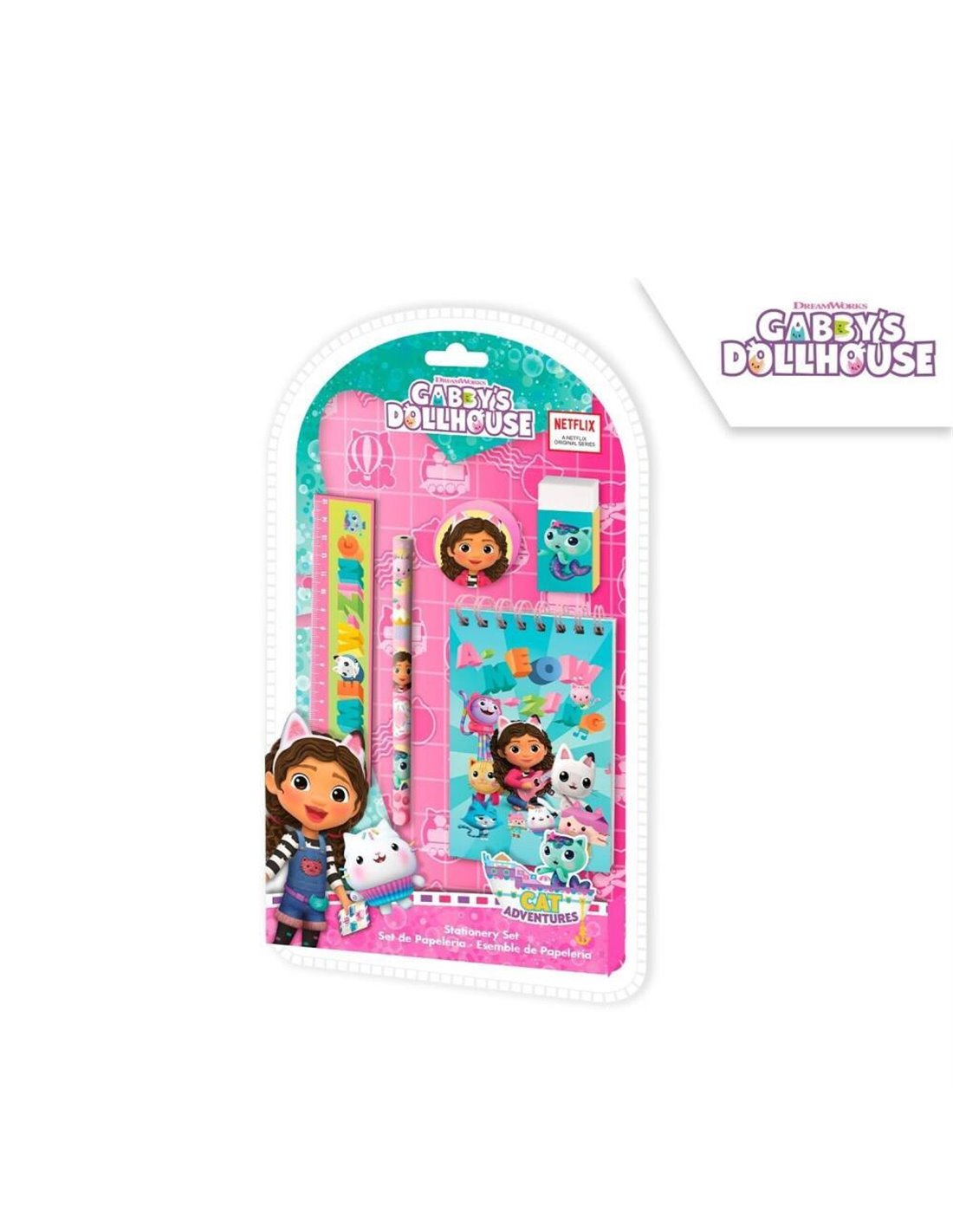Σχολικό σετ 5 τεμαχίων Το Κουκλόσπιτο της Γκάμπι. Το σετ περιλαμβάνει όλα τα απαραίτητα σχολικά εργαλεία, όπως ξύστρα, γόμα, μολύβι, σημειωματάριο και χάρακα, προσφέροντας ολοκληρωμένη λύση για τις καθημερινές ανάγκες του σχολείου. Ο χαρούμενος και πολύχρωμος σχεδιασμός θα κάνει τη μελέτη πιο ευχάριστη και διασκεδαστική για τα παιδιά.