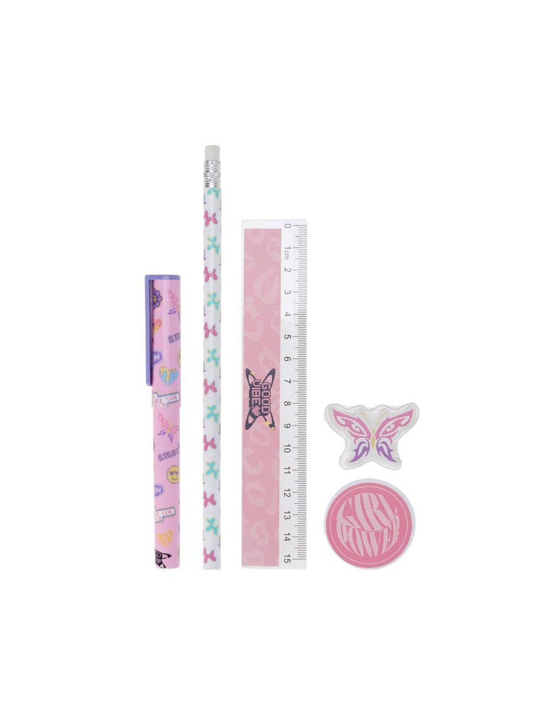Το σετ περιλαμβάνει ένα μολύβι HB, ένα στυλό ballpoint με μπλε μελάνι γραφής13εκ., έναν χάρακα 15εκ., 1 γόμα Ø4x1,2εκ. και μια ξύστρα Ø2,8εκ.