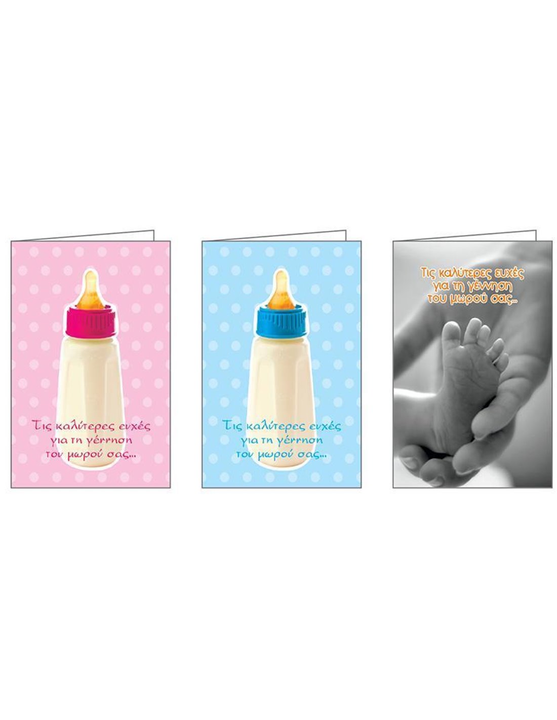 Ευχετήριες κάρτες γέννησης με φάκελο. Διπλή κάρτα με διαστάσεις (κλειστή) 7x10,5εκ., (ανοιχτή) 10,5x14εκ. Κοκτέηλ 3 σχέδια.