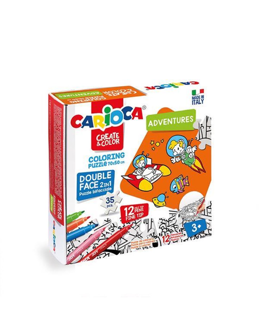 Carioca puzzle χρωματισμού 35 κομματιών Adventures, διπλής όψης με 2 θέματα. Στη συσκευασία περιλαμβάνονται και 12 super πλενόμενοι μαρκαδόροι. Διαστάση puzzle: 70x35εκ. Υπέροχο δώρο για τους μικρούς ζωγράφους, αλλά και ιδανική λύση για παιδικούς σταθμούς, νηπαγωγεία, σχολεία, κ.α.