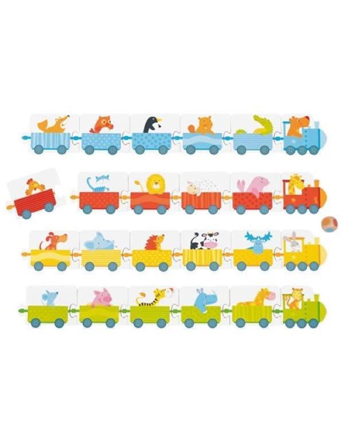 Περιλαμβάνει 1 χρωματιστό ζάρι, 4 τρένα και 20 βαγόνια.