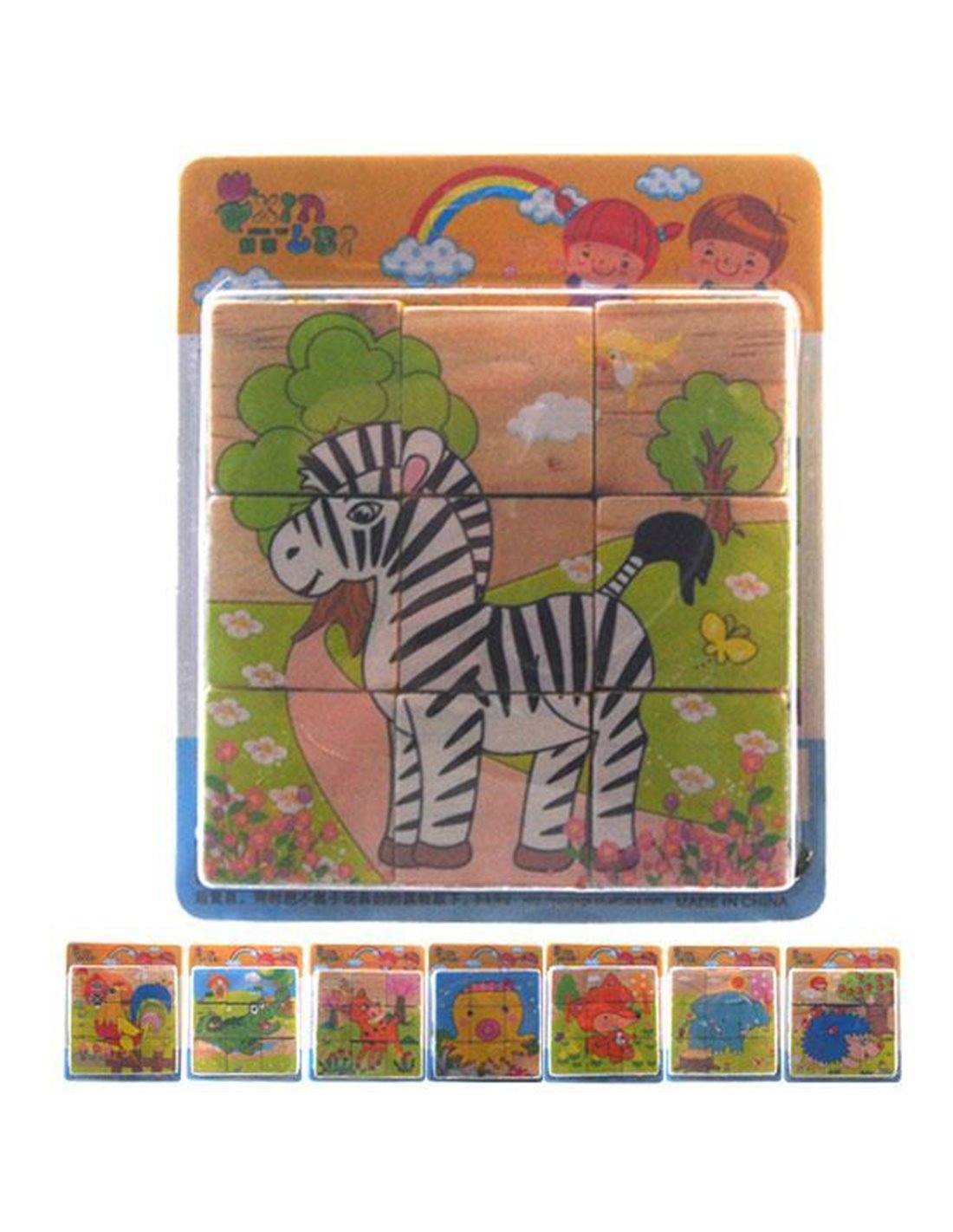 Ξύλινα παζλ-κύβοι. Με τους ξύλινους κύβους-παζλ το παιδί μπορεί να δημιουργήσει έξι διαφορετικά σχέδια αγαπημένων ζώων και να βελτιώσει τον συγχρονισμό χεριού-ματιού. Κατάλληλο για ηλικίες 2 ετών+. Διαστάσεις: 10,5x10.5εκ.
