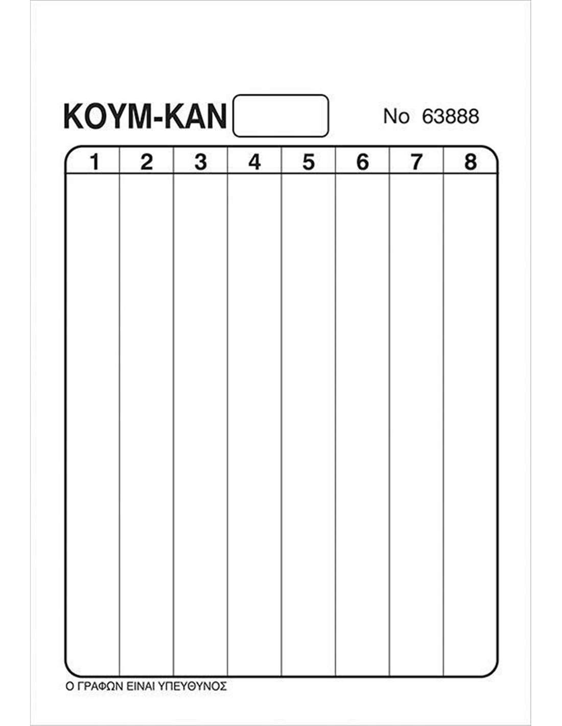 Μπλοκ ΚΟΥΜ ΚΑΝ 100 φύλλων, με 8 στήλες και αρίθμηση. Διαστάσεις: 14χ21εκ. Βοηθητικό έντυπο σημειώσεων επιδόσεων σε τυχερά παιχνίδια.