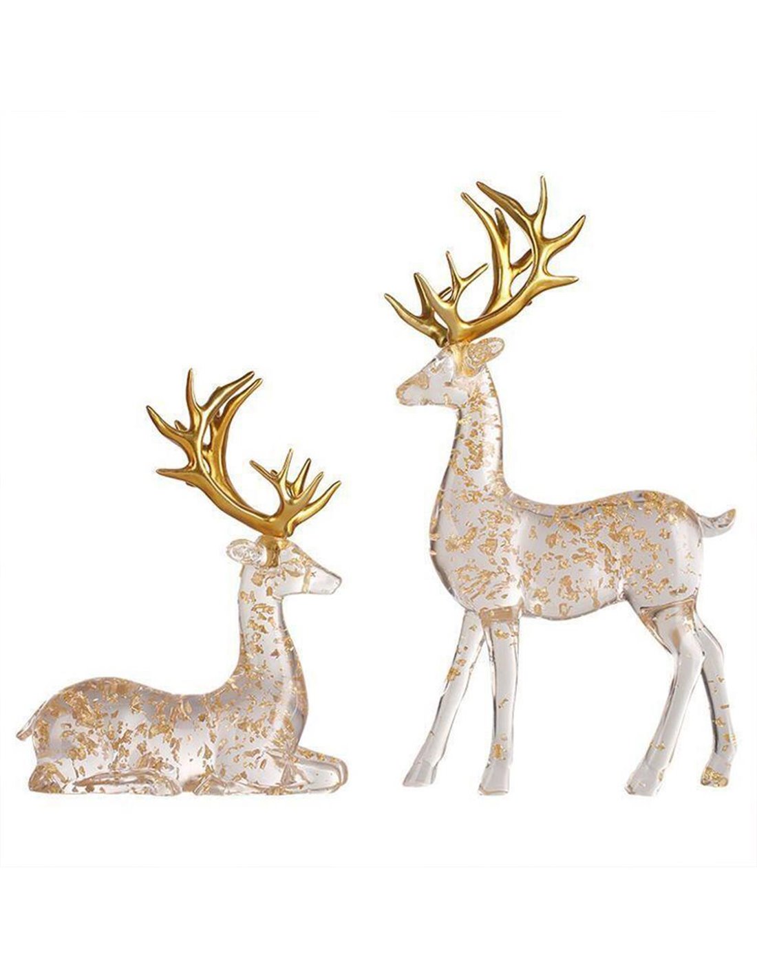 Προσθέστε μια αίσθηση κομψότητας και γιορτινής μαγείας στο σπίτι σας με αυτό το υπέροχο σετ διακοσμητικών ελαφιών. Το σετ περιλαμβάνει δύο ελαφάκια, κατασκευασμένα με προσοχή στη λεπτομέρεια. Αυτά τα ελαφάκια διαθέτουν λαμπερά χρυσά κέρατα και γυαλιστερές διακοσμήσεις που προσθέτουν μια πολυτελή αίσθηση στο χώρο σας. Τα διαφανή σώματά τους με χρυσές νιφάδες αποπνέουν μια αίσθηση κομψότητας και φινέτσας. Ιδανικά για το σαλόνι, την τραπεζαρία ή το υπνοδωμάτιο, αυτά τα διακοσμητικά ελαφάκια θα προσθέσουν μια μαγευτική και ζεστή χριστουγεννιάτικη ατμόσφαιρα σε κάθε γωνιά του σπιτιού σας. Διαστάσεις: Υ31,8x20,5x9εκ. - Υ22x18,5x9εκ.
