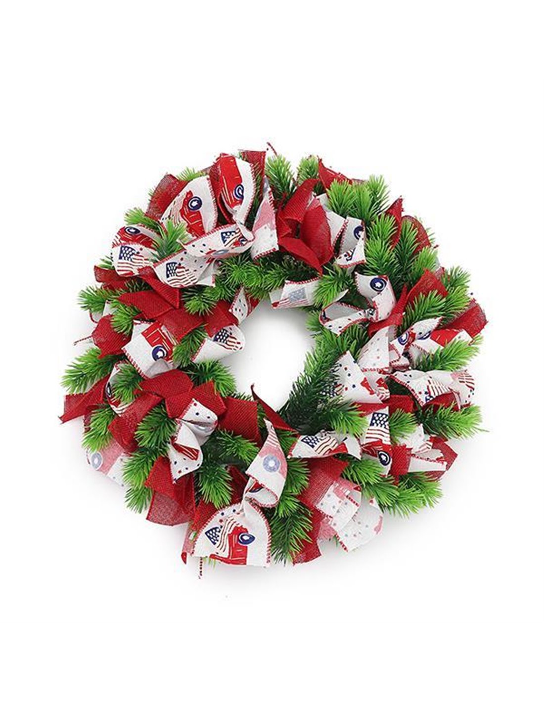 Χριστουγεννιάτικο διακοσμητικό στεφάνι με διάφορα κλαδιά και κορδέλες.
