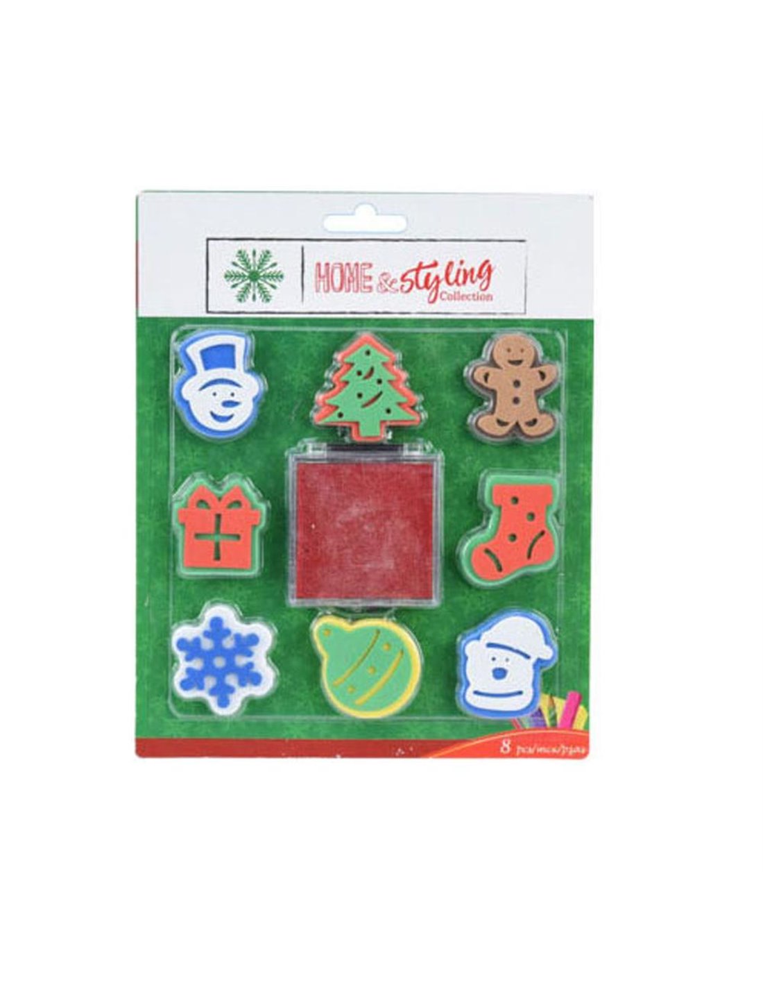 Χριστουγεννιάτικο σετ σφραγίδων 9 τεμαχίων, που περιλαμβάνει 8 χριστουγεννιάτικες σφραγίδες και 1 ταμπόν με μελάνι, τοποθετημένο σε κουτί. Το σετ έχει διαστάσεις 16,5x20,5x1 εκ., ενώ το ταμπόν είναι 5x5 εκ. και οι σφραγίδες έχουν διάμετρο 4 εκ. Το σετ περιλαμβάνει σφραγίδες σε χρώματα κόκκινο, πράσινο, μπλε, λευκό, καφέ και κίτρινο, και είναι συσκευασμένο σε blistercard.