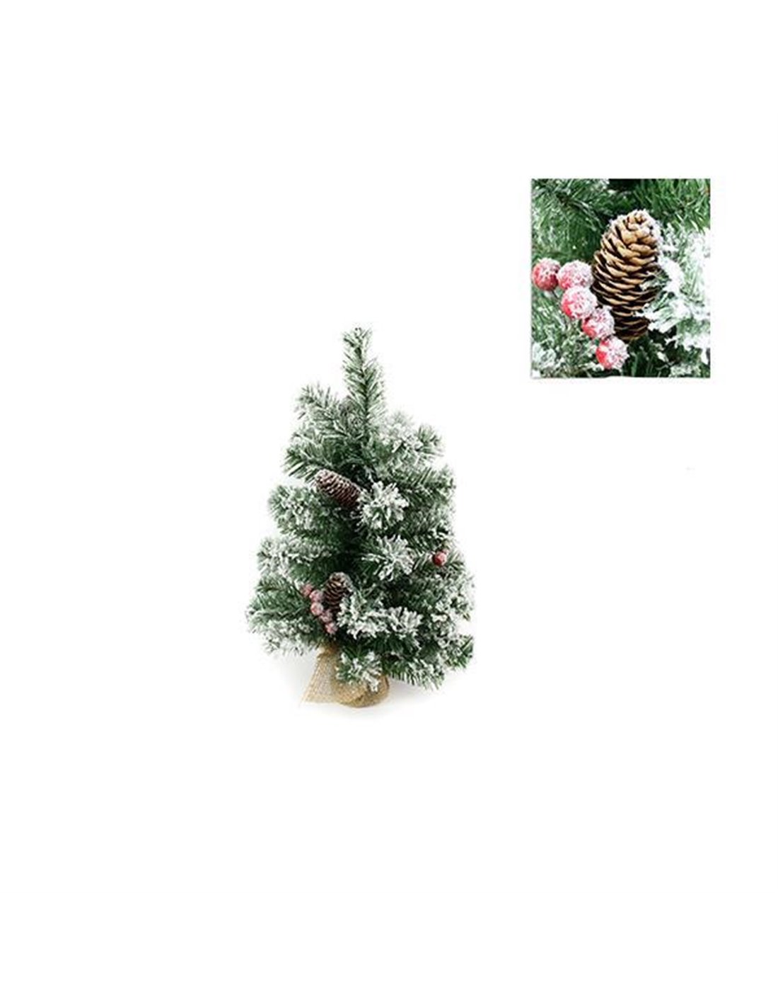 Χριστουγεννιάτικο δέντρο τύπου έλατο. Διακοσμημένο με χιόνι και κουκουνάρια και βάση επενδεδυμένη με λινάτσα. Ύψος: 45εκ.