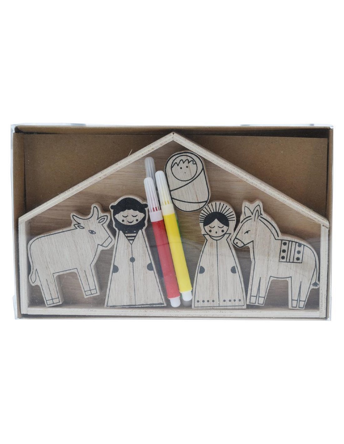 Χριστουγεννιάτικο σετ ζωγραφικής φάτνης, κατασκευασμένο από 30% κόντρα πλακέ και 70% MDF. Το σετ περιλαμβάνει 9 τεμάχια: σπιτάκι, τον Ιωσήφ, τη Μαρία, το Θείο Βρέφος, αγελάδα, άλογο και μάγους. Κάθε φιγούρα είναι σε φυσικό χρώμα, και το σετ περιλαμβάνει τέσσερις μαρκαδόρους σε κόκκινο, μπλε, κίτρινο και πράσινο για ζωγραφική.