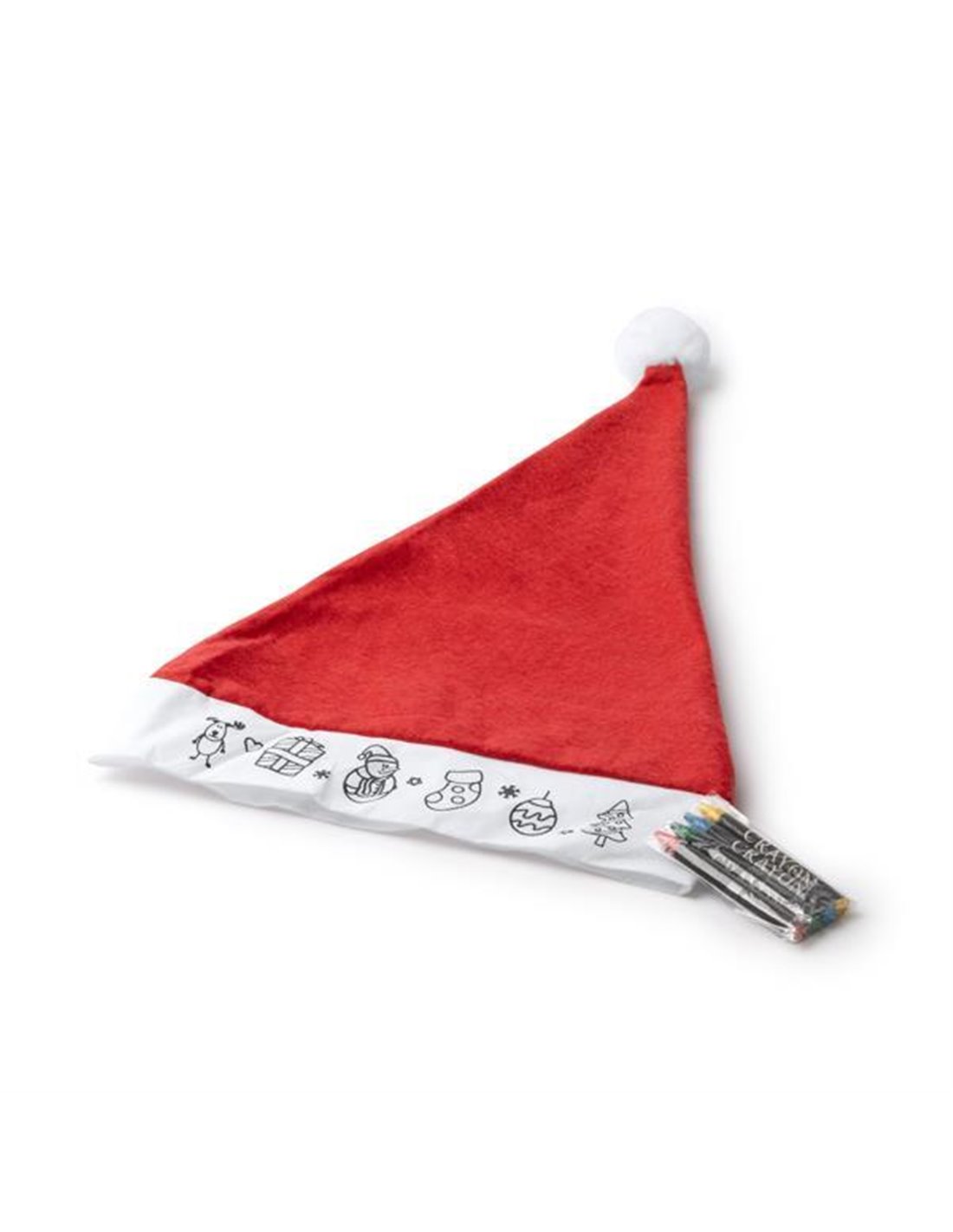 Χριστουγεννιάτικος σκούφος Άι Βασίλη. Έχει χριστουγεννιάτικα σχέδια στο μπροστινό μέρος της λευκής λωρίδας, τα οποία μπορείτε να βάψετεμε τις 4 χρωματιστές κηρομπογιές (κόκκινη, κίτρινη, πράσινη και μπλε) που περιλαμβάνονται4.
