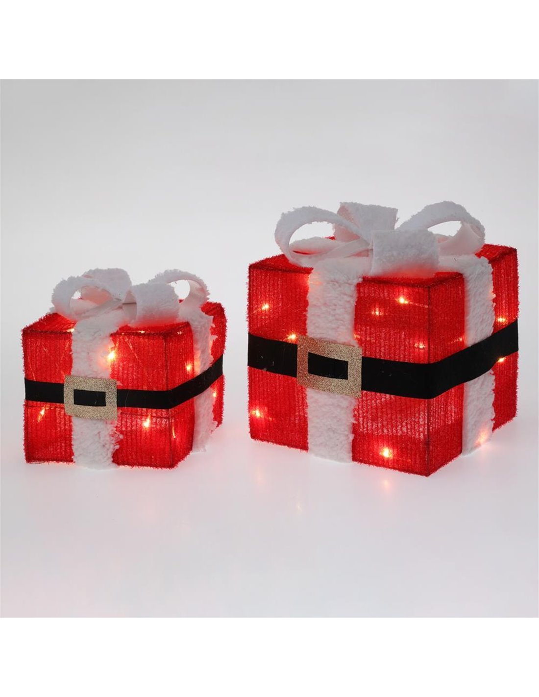 Σετ δύο χριστουγεννιάτικων διακοσμητικών σε σχήμα δώρου με LED φωτισμό. Κατασκευασμένα από PE και μέταλλο, σε κόκκινη απόχρωση με λευκό φιόγκο, δημιουργούν ζεστή γιορτινή ατμόσφαιρα στον χώρο. Το σετ περιλαμβάνει δύο μεγέθη με θερμό λευκό φωτισμό και λειτουργία χρονοδιακόπτη 6/18 ωρών, ιδανικά για να τοποθετηθούν κάτω από το δέντρο, στο σαλόνι ή σε μπαλκόνι.