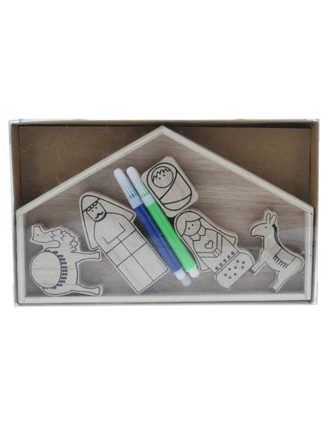 Χριστουγεννιάτικο σετ ζωγραφικής φάτνης, κατασκευασμένο από 30% κόντρα πλακέ και 70% MDF. Το σετ περιλαμβάνει 9 τεμάχια: σπιτάκι, τον Ιωσήφ, τη Μαρία, το Θείο Βρέφος, καμήλα, άλογο και μάγους. Κάθε φιγούρα είναι σε φυσικό χρώμα, και το σετ περιλαμβάνει τέσσερις μαρκαδόρους σε κόκκινο, μπλε, κίτρινο και πράσινο για ζωγραφική.