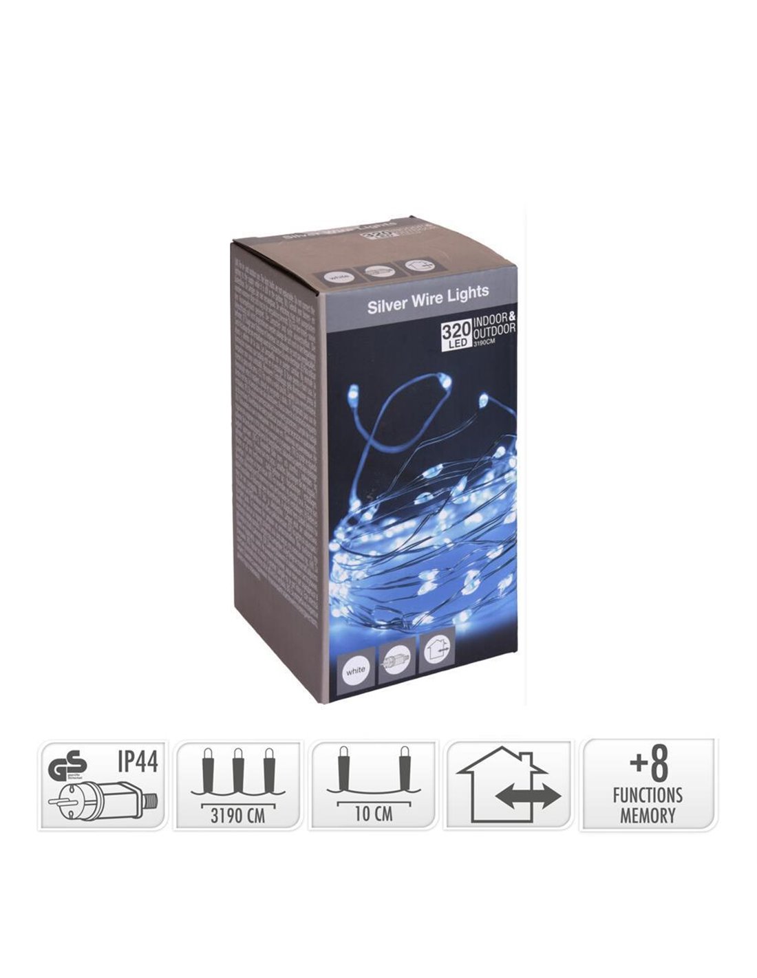 Το προϊόν είναι LED λαμπάκια τύπου silver wire με μικροσκοπικά λευκά φώτα (320 microLED) σε μορφή cluster. Διαθέτουν διάμετρο καλωδίου 0,3mm² με επικάλυψη PP και συνολικό μήκος 7,2 μέτρων, ενώ το καλώδιο σύνδεσης (lead wire) είναι μήκους 5 μέτρων. Το προϊόν συνοδεύεται από προσαρμογέα IP44, κατάλληλο για εξωτερική χρήση. Διαστάσεις συσκευασίας: 8x8x15εκ.