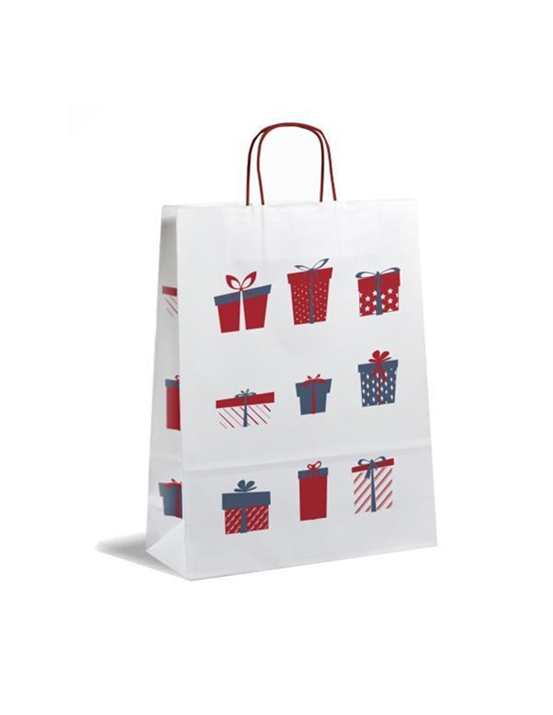 Χάρτινη τσάντα λευκή με χριστουγενιάτικο μοτίβο και κόκκινο στριφτό χερούλι. Διαστάσεις: Υ22x18x8εκ. Δυνατότητα εκτύπωσης του δικού σας λογότυπου.