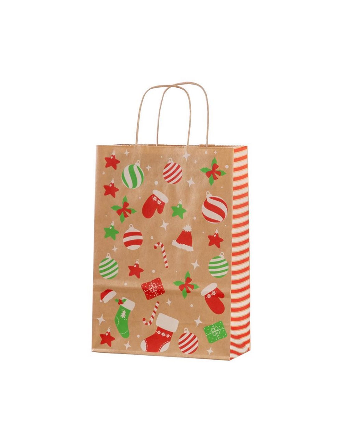 Χάρτινη τσάντα καφέ με χριστουγενιάτικο μοτίβο. Διαστάσεις:Υ41x32x12εκ