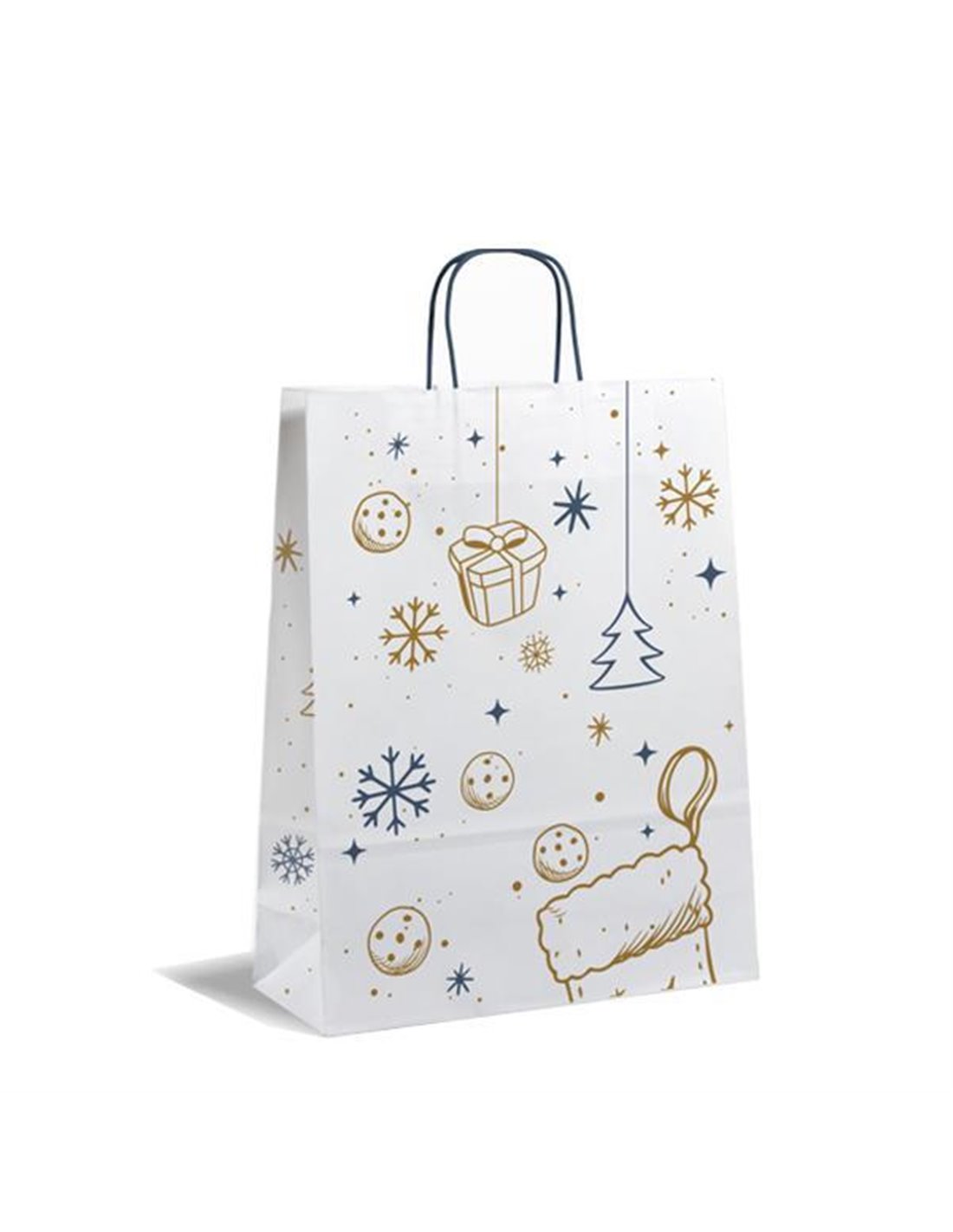 Χάρτινη τσάντα λευκή με χριστουγενιάτικο μοτίβο και μπλε στριφτό χερούλι. Διαστάσεις: Υ35x26x12εκ. Δυνατότητα εκτύπωσης του δικού σας λογότυπου.
