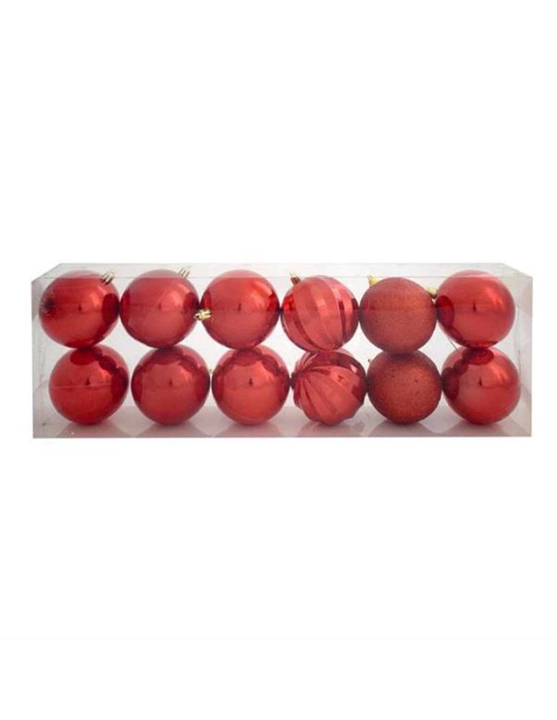 Χριστουγεννιάτικες μπάλες πλαστικές. Σε διάφανο κουτί pvc των 12 τεμαχίων 48x8x16εκ. Χρώμα: κόκκινο.