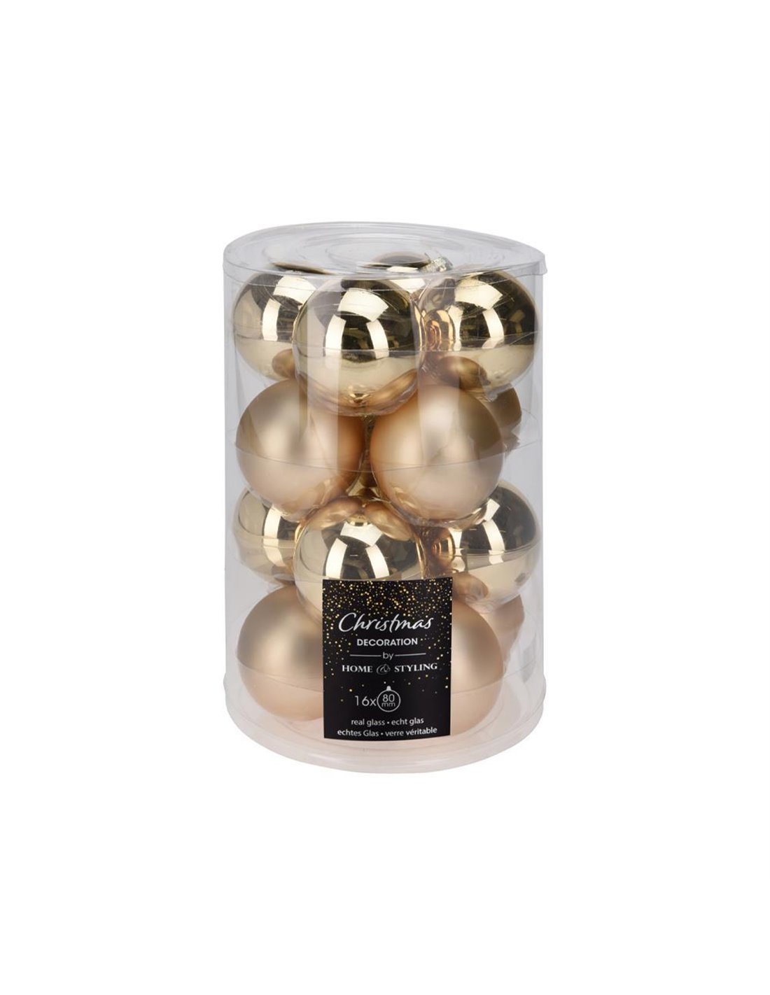 Σετ 16 χριστουγεννιάτικων γυάλινων μπαλών Ø8εκ. σε χρυσό χρώμα, με 8 ματ και 8 γυαλιστερές. Η κομψή διπλή υφή τους χαρίζει εντυπωσιακό αποτέλεσμα και πολυτέλεια στον στολισμό του δέντρου. Ιδανικές για μεγαλύτερα δέντρα ή για όσους θέλουν ένα πιο έντονο διακοσμητικό στοιχείο στις γιορτές.