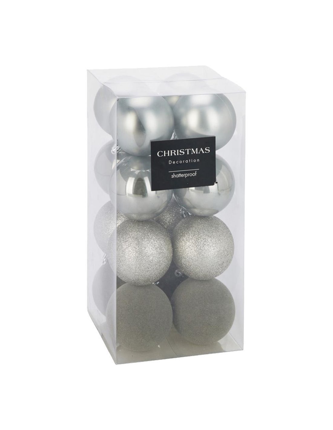 Σετ 16 χριστουγεννιάτικες μπάλες σε ασημί απόχρωση με τέσσερα διαφορετικά φινιρίσματα: ματ, περλέ, γκλίτερ και βελούδο. Με διάμετρο 8 εκ., προσφέρουν ποικιλία υφών και λάμψης που αναδεικνύει το χριστουγεννιάτικο δέντρο. Κατασκευασμένες από ανθεκτικό πολυπροπυλένιο, συνδυάζουν κομψότητα και αντοχή.