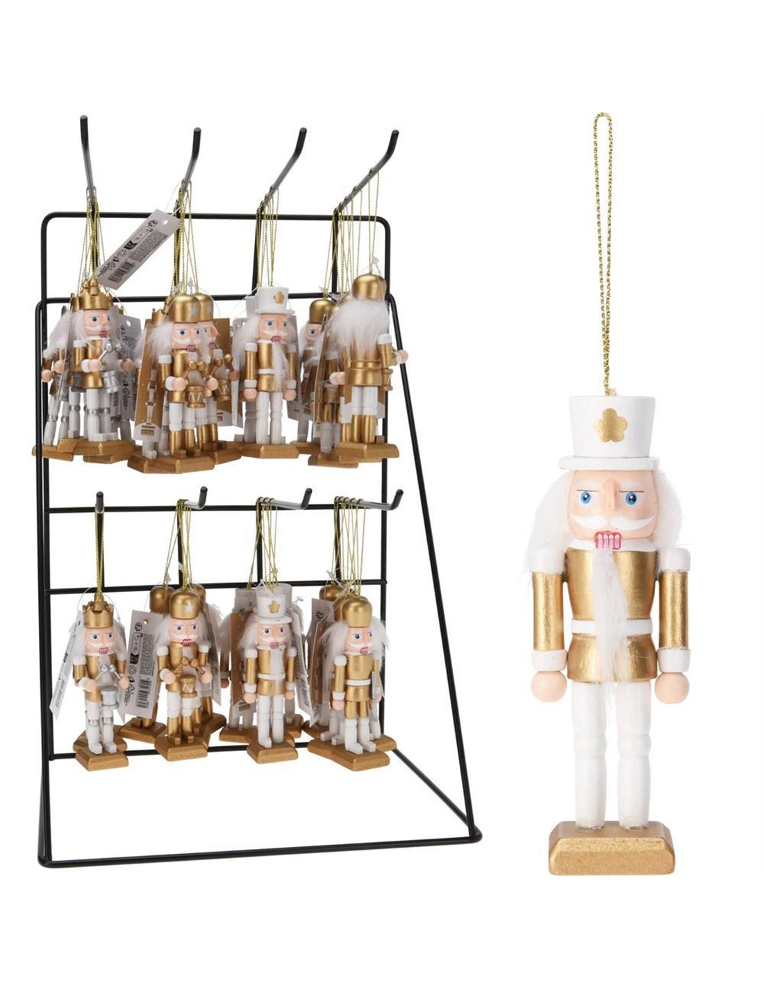 Αυτό το σετ καρυοθραύστη, εκτός από την κομψή λευκή και χρυσή αισθητική, είναι σχεδιασμένο ως κρεμαστό, καθιστώντας το ιδανικό για διακόσμηση του χριστουγεννιάτικου δέντρου. Οι καρυοθραύστες μπορούν να κρεμαστούν εύκολα, προσθέτοντας μια παραδοσιακή, εορταστική ατμόσφαιρα στο δέντρο σας. Τα τέσσερα διαφορετικά σχέδια προσφέρουν ποικιλία και στυλ, συνδυάζοντας τη χριστουγεννιάτικη παράδοση με τη μοντέρνα διακόσμηση, κάνοντάς τους ιδανικούς για τη γιορτινή περίοδο. Διαστάσεις καρυοθραύστη: Υ10x∅3,5εκ.