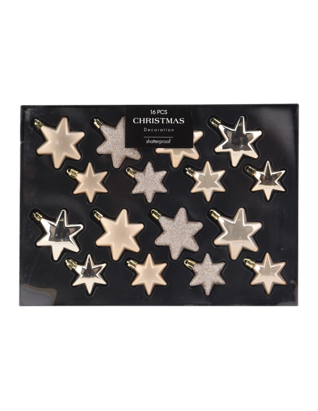 Το σετ χριστουγεννιάτικων στολιδιών περιλαμβάνει 16 τεμάχια σε σχήμα αστεριού, σε 3 διαφορετικά σχέδια και κρεμ χρώμα. Το σετ περιέχει δύο διαφορετικές διαστάσεις 6x0,8εκ. - 5x0,8εκ., προσφέροντας ποικιλία στη διακόσμηση του δέντρου. Οι κρεμ αποχρώσεις τους δίνουν μια λαμπερή και γιορτινή αίσθηση, ενώ τα διαφορετικά σχέδια και μεγέθη προσθέτουν βάθος και ποικιλία στο στολισμό, κάνοντας το δέντρο να ξεχωρίζει με κομψότητα και λάμψη. Διαστάσεις συσκευασίας: 35x2,2x31εκ.