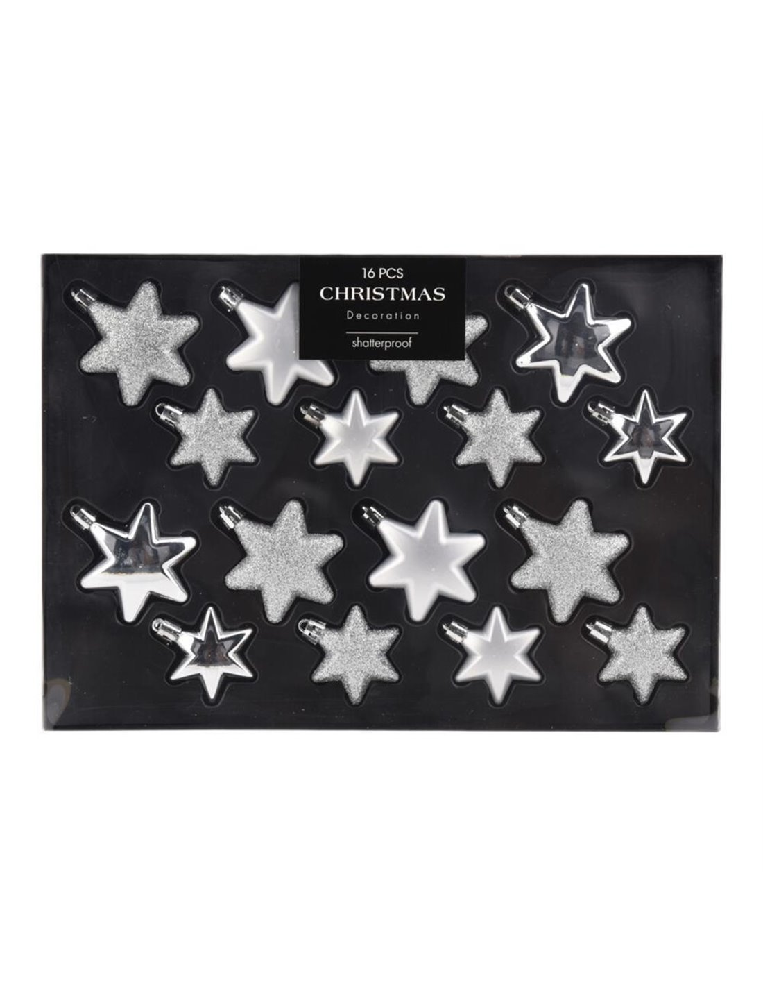 Το σετ χριστουγεννιάτικων στολιδιών περιλαμβάνει 16 τεμάχια σε σχήμα αστεριού, σε 3 διαφορετικά σχέδια και ασημί χρώμα. Το σετ περιέχει δύο διαφορετικές διαστάσεις 6x0,8εκ. - 5x0,8εκ., προσφέροντας ποικιλία στη διακόσμηση του δέντρου. Οι ασημί αποχρώσεις τους δίνουν μια λαμπερή και γιορτινή αίσθηση, ενώ τα διαφορετικά σχέδια και μεγέθη προσθέτουν βάθος και ποικιλία στο στολισμό, κάνοντας το δέντρο να ξεχωρίζει με κομψότητα και λάμψη. Διαστάσεις συσκευασίας: 35x2,2x31εκ.